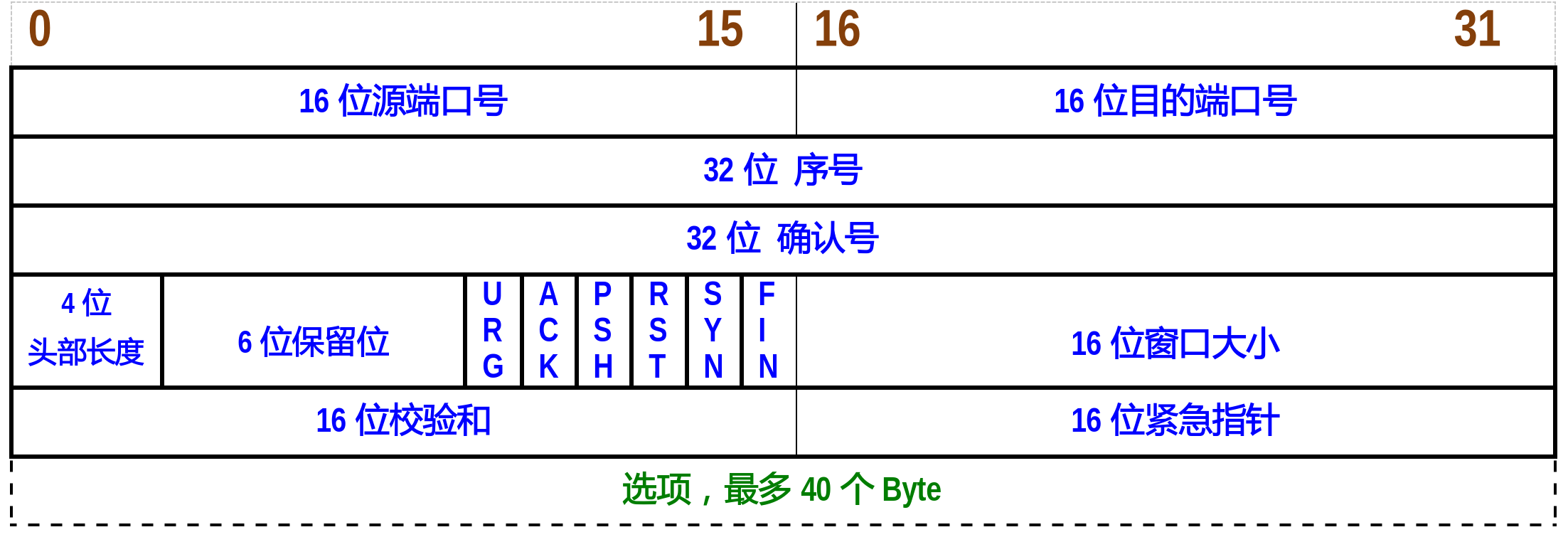 TCP头部由固定头部(20字节)、头部选项(最长40字节)组成。